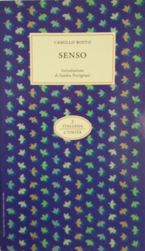 ♦ Camillo Boito, SENSO e altri racconti ( Macchia grigia / Il collare di Budda / Meno di un giorno / Il demonio muto / Senso ), introduzione di Sandra Petrignani. Roma, Editrice l’Unità, Collana «I Libri dell’Unità – Italiana, n.3 (supplemento al n.38 dell’Unità del 4 ottobre 1993), settembre 1993. Brossura a colori con composizione grafica di Giovanni Lussu. Pp. 130. Cm. 18,5 x 11.
