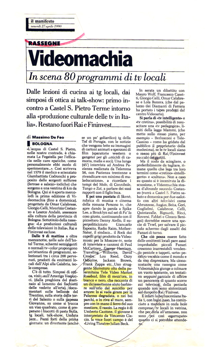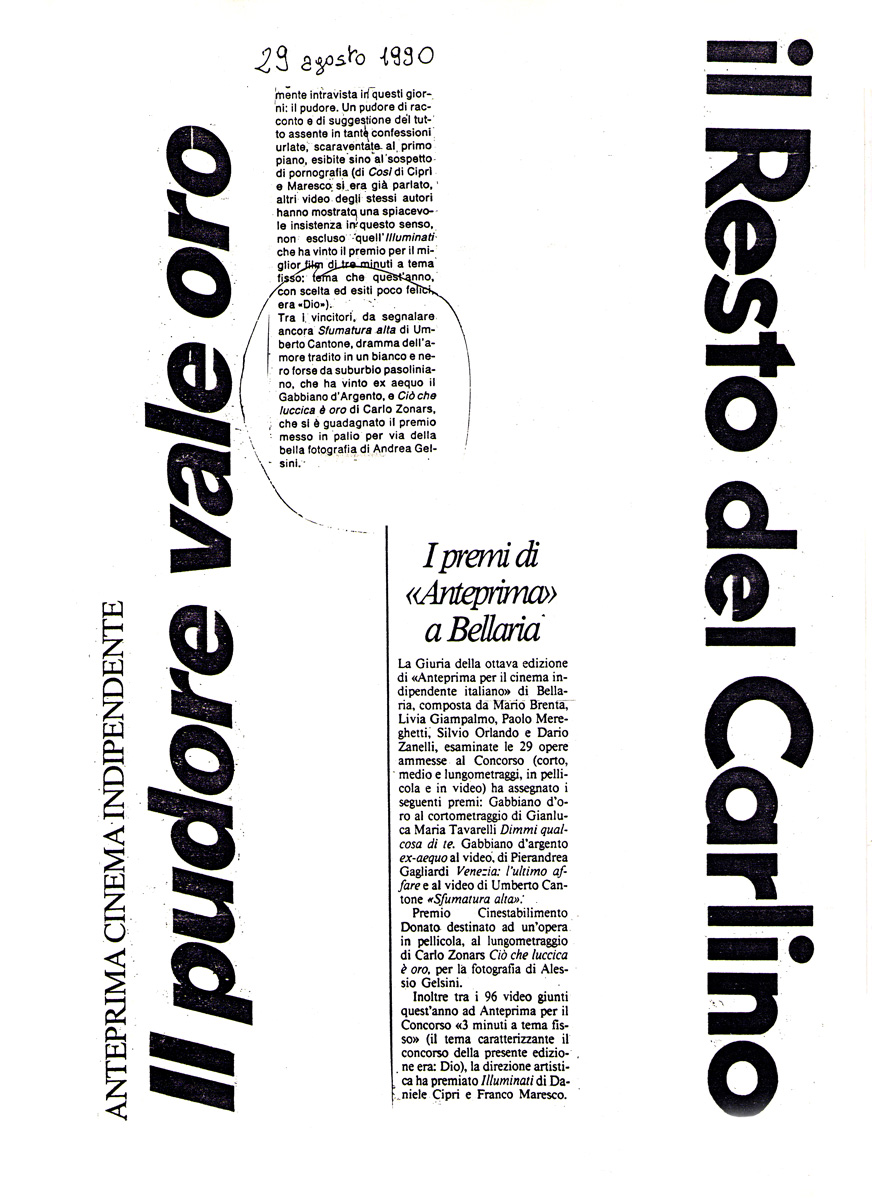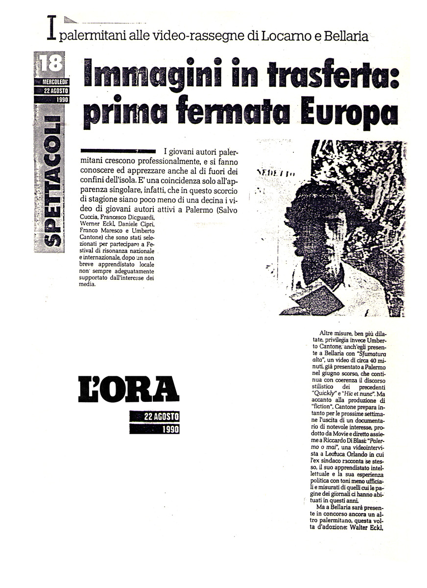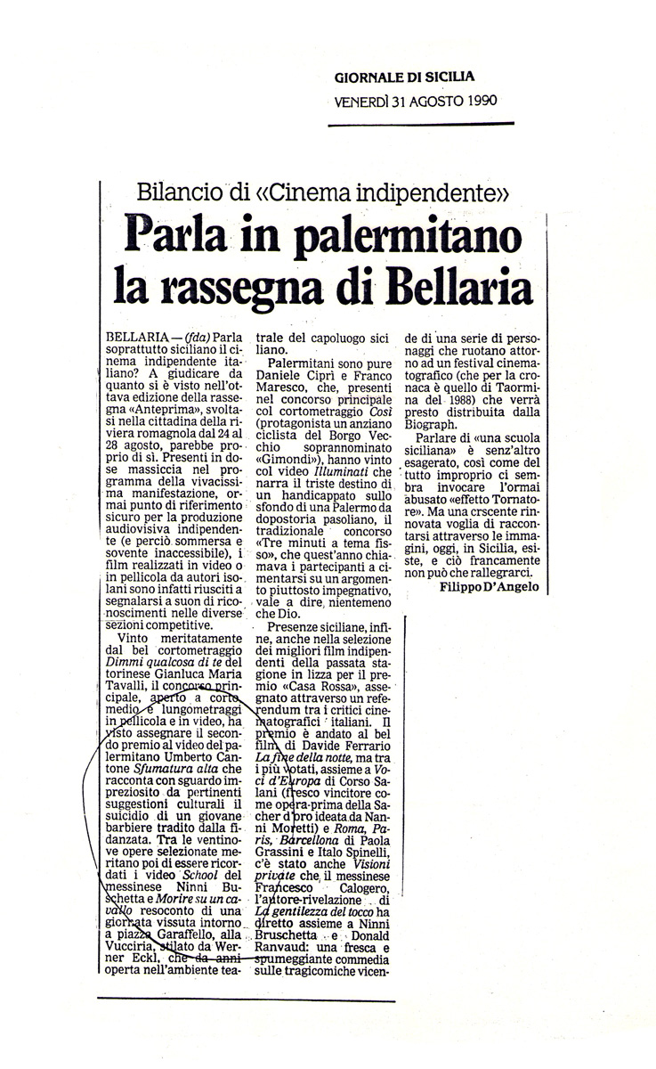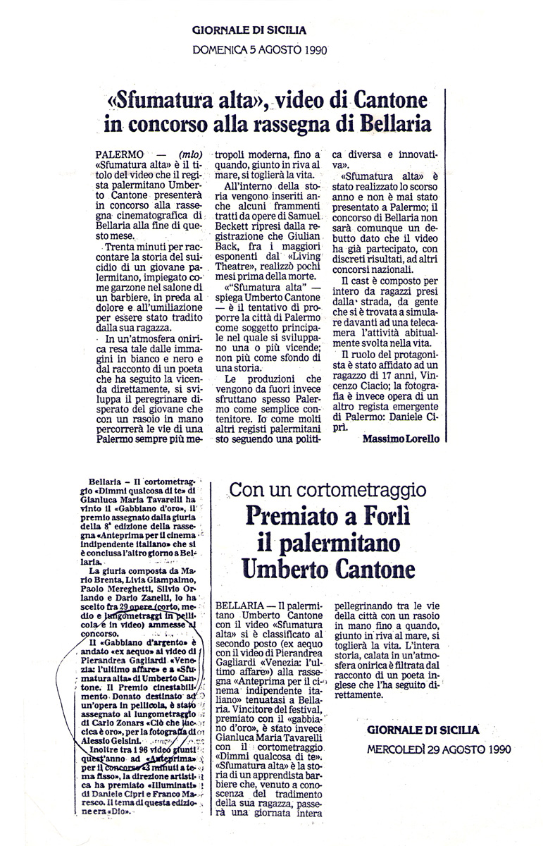«SFUMATURA ALTA», VIDEO DI CANTONE IN CONCORSO ALLA RASSEGNA DI BELLARIA di Massimo Lorello (Giornale di Sicilia, 5 agosto 1990)