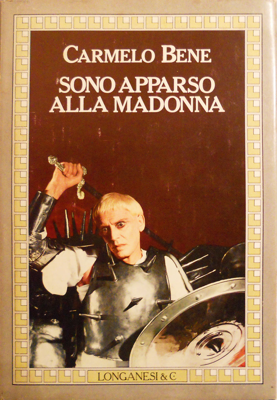 Prima edizione dell'”autobiografia” di Carmelo Bene, Sono apparso alla Madonna, finita di stampare dalla TIMEC di Albairate (Milano) per conto della Longanesi & C. nel gennaio 1983. La grafica della sopraccoperta, dove campeggia una fotografia a colori di C.B. durante lo spettacolo Macbeth scattata da Cristina Ghergo, è di John Alcorn.