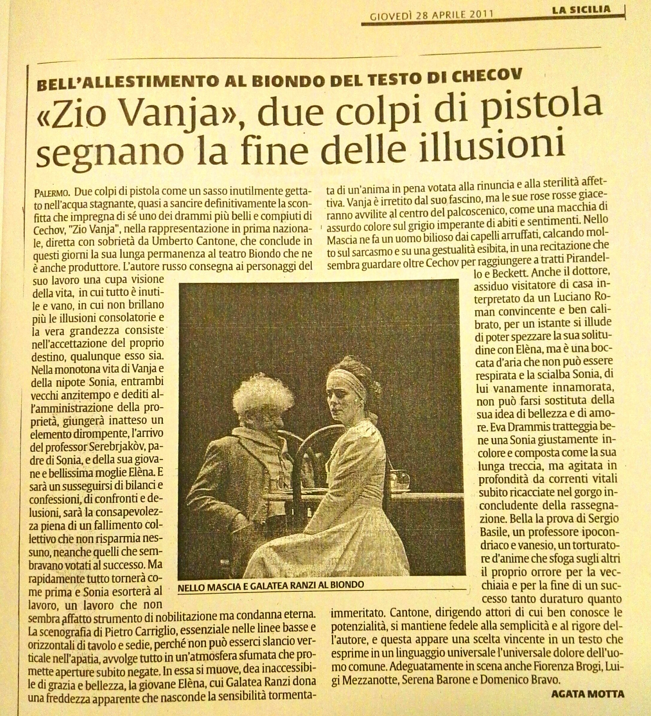 Il riferimento è al capolavoro cechoviano Zio Vanja (1899) e alla celebre Mandragola di Machiavelli (1518), messi in scena uno dopo l’altro, ad aprile e maggio, dalla Compagnia del Teatro Biondo Stabile di Palermo, entrambi diretti da Umberto Cantone e accolti con consensi convinti dai numerosi spettatori.
