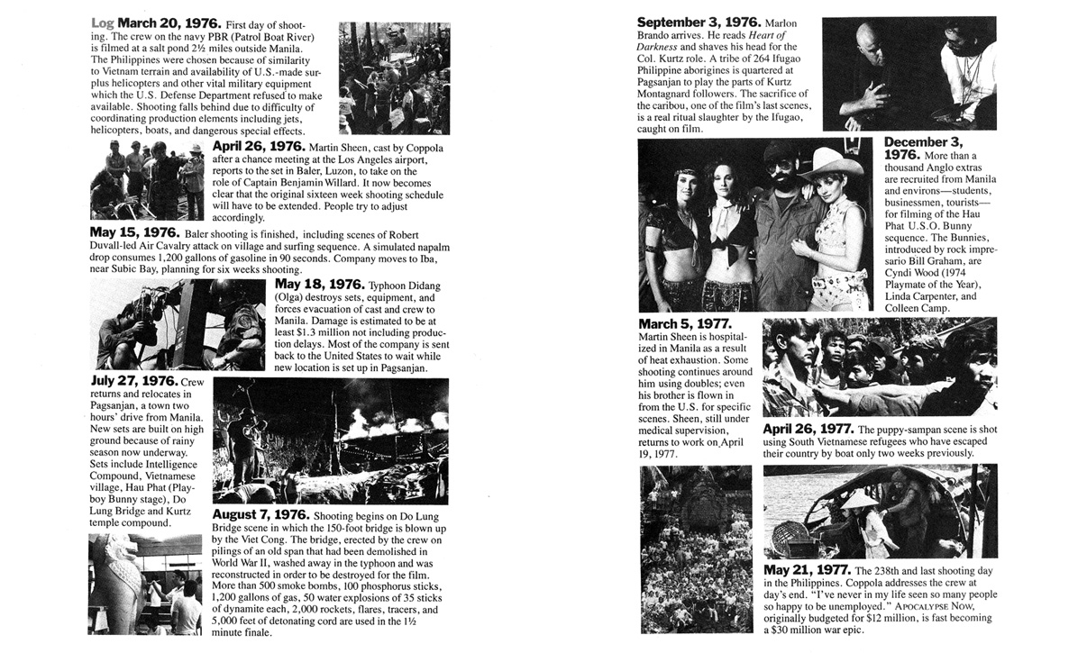 ” Non volevo aggiungere titoli di testa o di coda al film, volevo invece che avesse una presentazione speciale, da opera teatrale. La mia idea era di distribuire questi libretti contenenti una lista completa degli attori e della troupe, oltre ad informazioni sul film (vedi in GALLERY). Lo facemmo nei primi cinema che proiettarono il film in 70 mm ” (Francis Ford Coppola)
