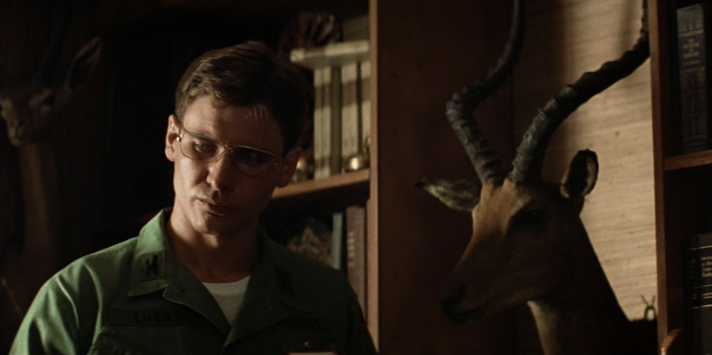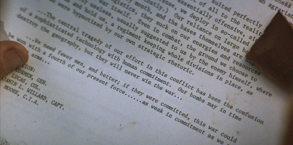 Willard inizia a studiare il dossier su Kurtz durante il viaggio in barca fino al fiume Nung, apprendendo che questo eroe pluridecorato della guerra di Corea ha avuto una carriera brillante e che, dal 1964 in poi, ha cambiato atteggiamento. Tornato da un giro d’ispezione di consiglieri militari in Vietnam, egli spedì un rapporto scomodo al presidente degli Stati Uniti e ai capi militari, chiedendo di essere trasferito tra i parà, poi arruolandosi nelle truppe speciali. Nel 1967, l’uomo organizzò di propria iniziativa l’operazione “Arcangelo” e, l’anno dopo, eliminò alcuni agenti accusati arbitrariamente da lui di fare il doppio gioco. Gradatamente, Kurtz ha dunque tagliato i ponti col comando e opera per conto suo. I vietnamiti lo conoscono di fama, per la sua ferocia. Le ultime notizie lo danno, completamente folle, alla guida di un gruppo di marines e di guerrieri nativi, “signore della guerra” e capo carismatico adorato dai fedeli di una fantomatica comunità nella giungla.