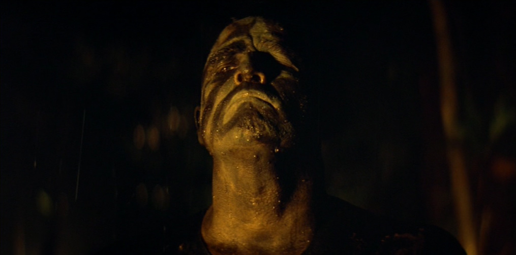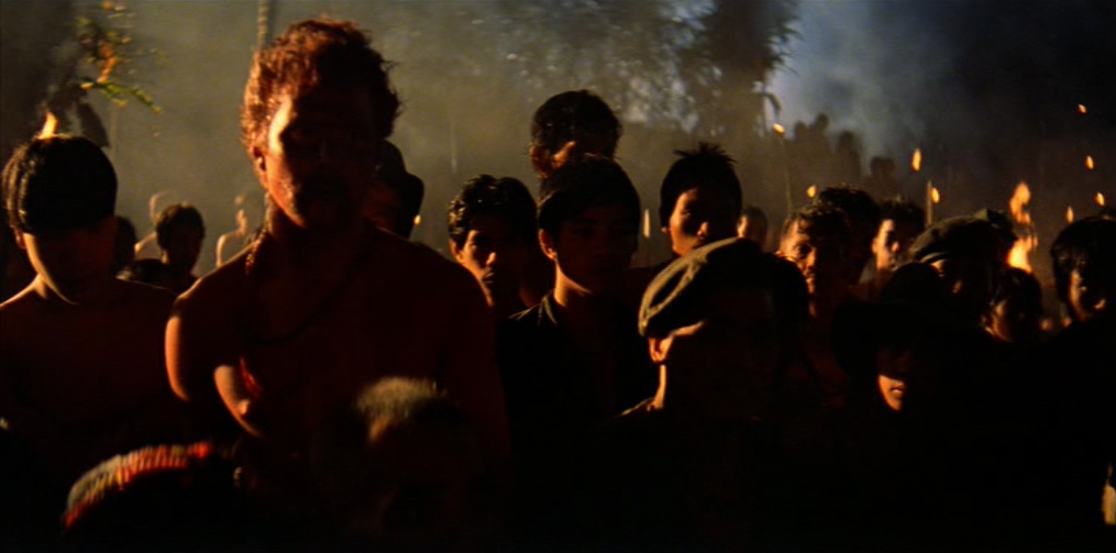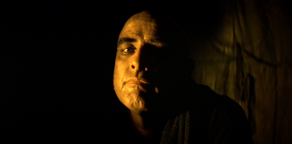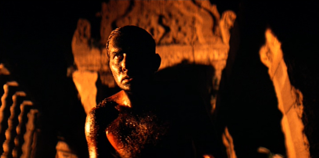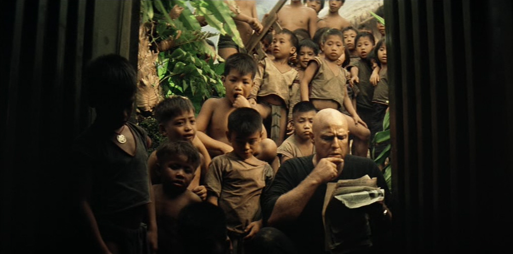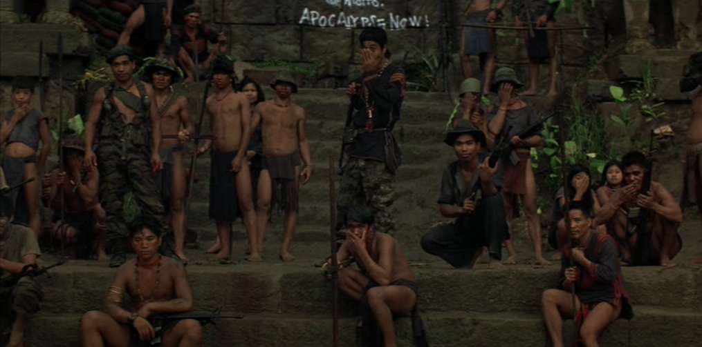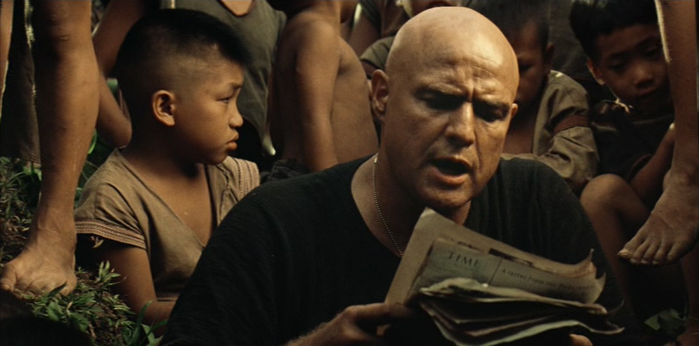 Il villaggio in mano a Kurtz appare dominato da un primitivo regime pagano e sanguinario: una moltitudine di cadaveri è distribuita sul lato di ognuno dei suoi sentieri. Willard viene presto imprigionato e successivamente liberato dal colonnello, il quale gli spiega le sue teorie sulla guerra, sull’umanità e sulla civiltà. Egli ha letto Il ramo d’oro di James Frazer (una della fonti della sua ispirazione), che spiega il sacrificio del Re-Sacerdote e la funzione purificatrice del capro espiatorio. In un inquietante monologo, Kurtz loda la ferocia sanguinaria e assolutamente priva di scrupoli degli alleati locali, prendendo ad esempio della loro perfezione guerriera l’occasione, da lui vissuta in prima persona, in cui tagliarono il braccio a tutti i bambini di un villaggio vaccinati dagli americani contro la poliomielite.
