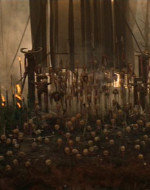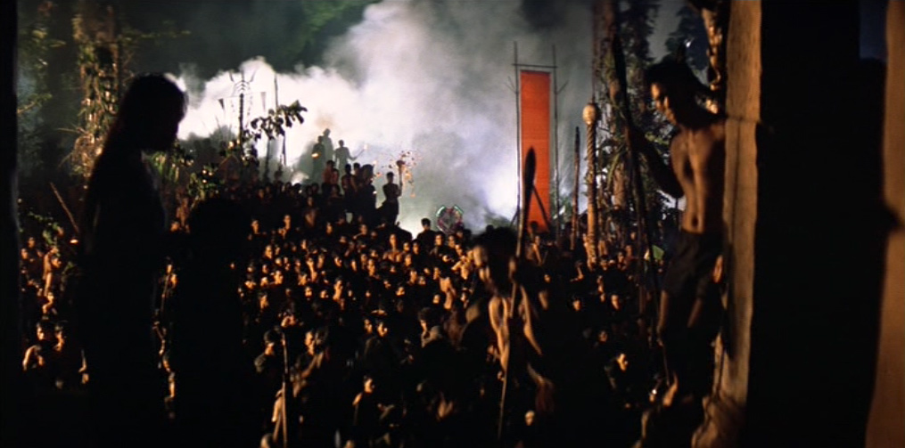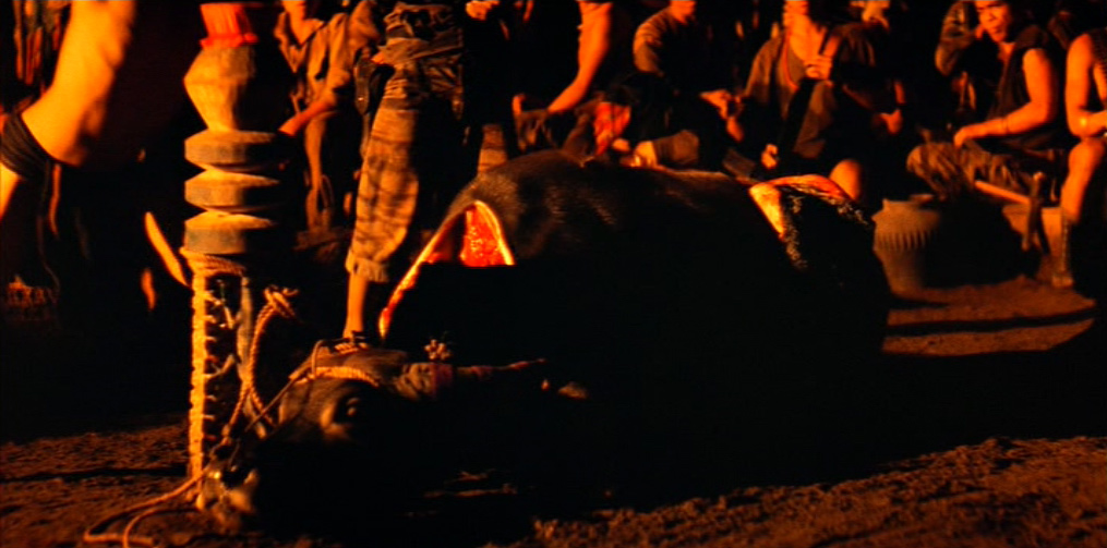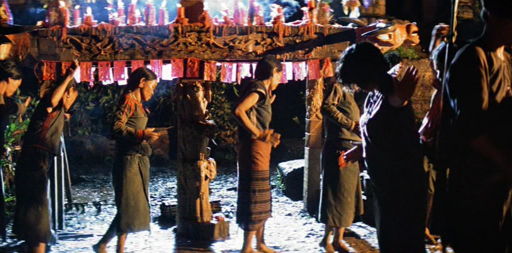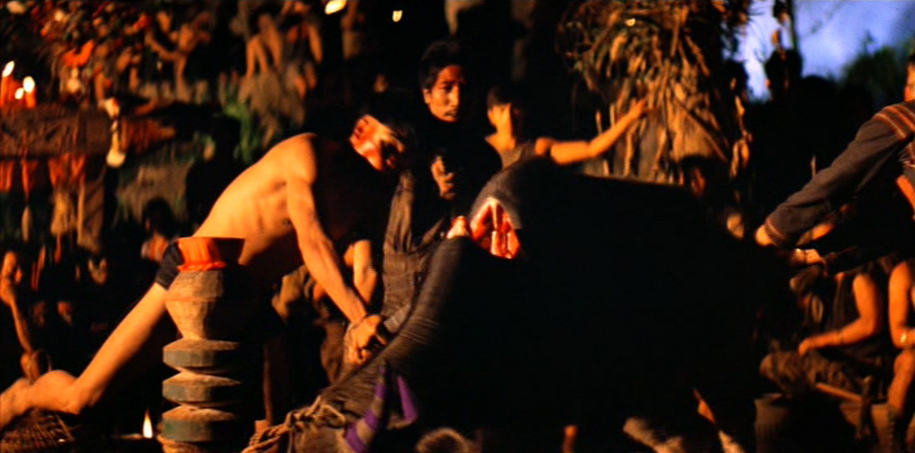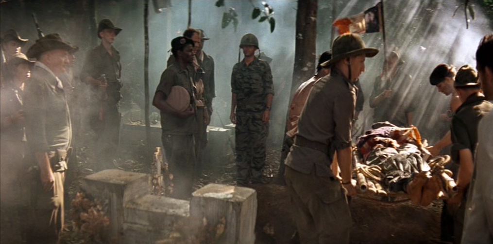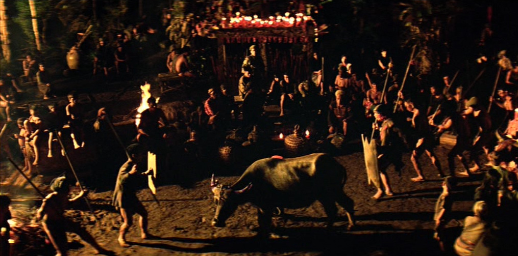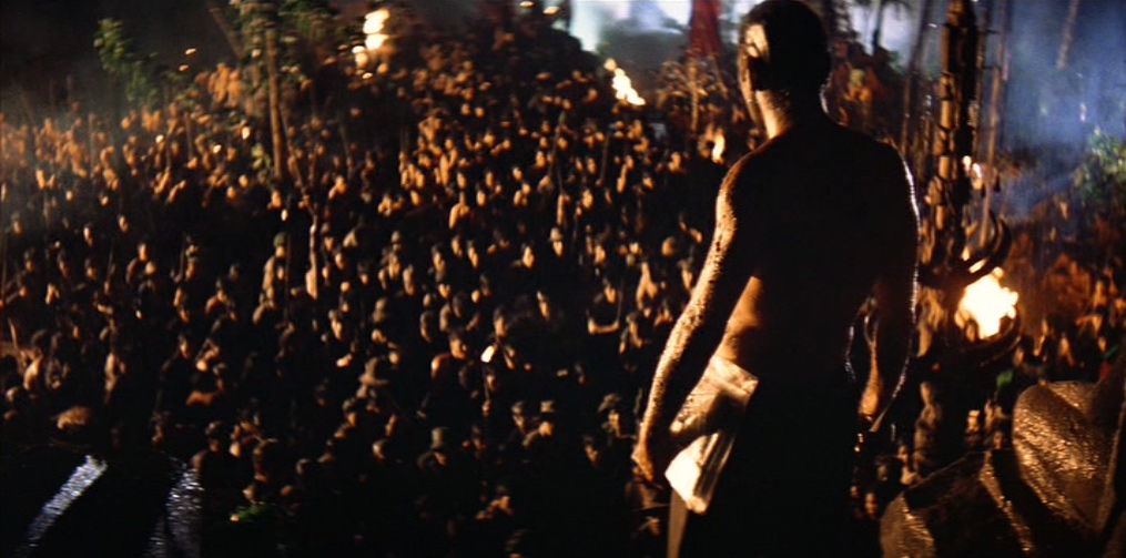 Il villaggio in mano a Kurtz appare dominato da un primitivo regime pagano e sanguinario: una moltitudine di cadaveri è distribuita sul lato di ognuno dei suoi sentieri. Willard viene presto imprigionato e successivamente liberato dal colonnello, il quale gli spiega le sue teorie sulla guerra, sull’umanità e sulla civiltà. Egli ha letto Il ramo d’oro di James Frazer (una della fonti della sua ispirazione), che spiega il sacrificio del Re-Sacerdote e la funzione purificatrice del capro espiatorio. In un inquietante monologo, Kurtz loda la ferocia sanguinaria e assolutamente priva di scrupoli degli alleati locali, prendendo ad esempio della loro perfezione guerriera l’occasione, da lui vissuta in prima persona, in cui tagliarono il braccio a tutti i bambini di un villaggio vaccinati dagli americani contro la poliomielite.