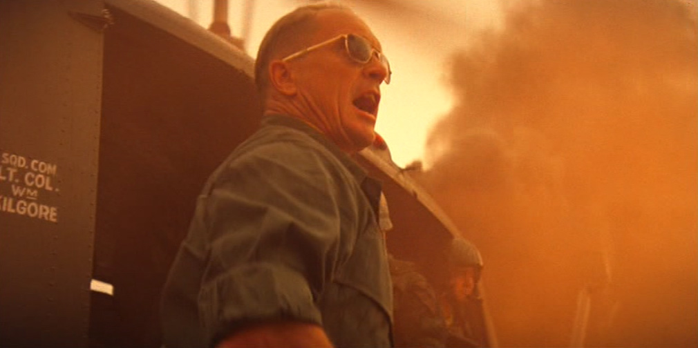 〈 Scena aggiunta nella versione Redux: Kilgore si dispera per come il bombardamento con il napalm abbia causato uno scemare delle onde, interrompendo l’ambita esibizione di surf. Con una mossa fulminea, Willard ruba la tavola preferita dal comandante e si allontana rapidamente insieme al suo plotone. 〉