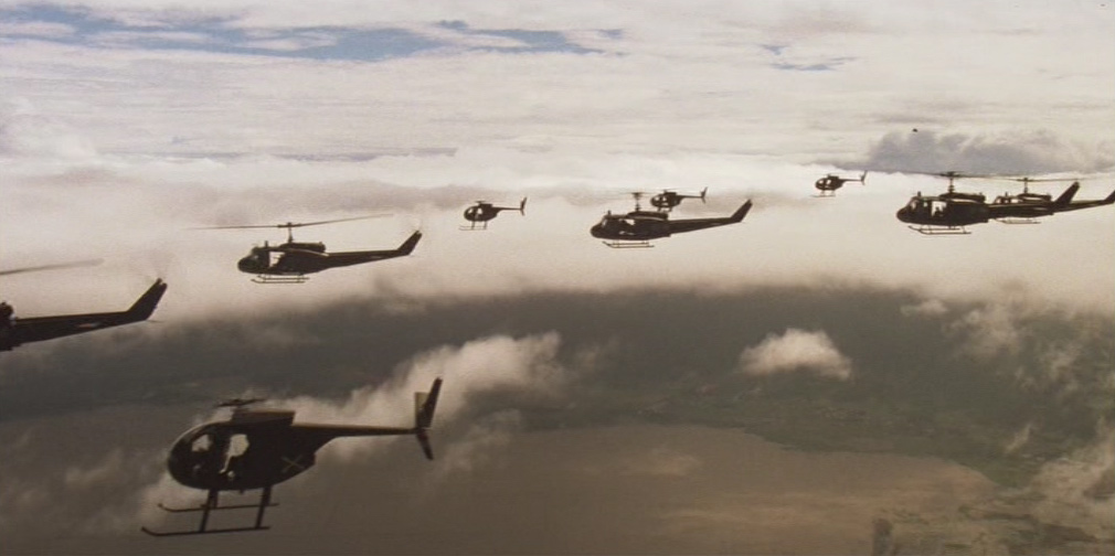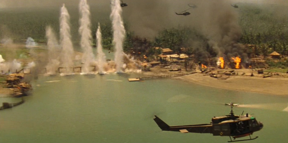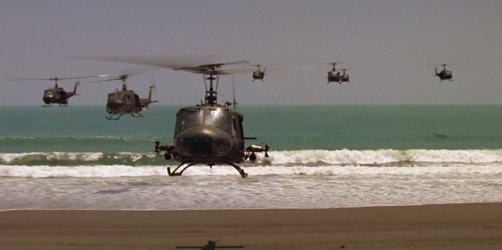 A bordo degli elicotteri, Kilgore e i suoi uomini attaccano un villaggio controllato dai vietcong, non distante dalla spiaggia, mentre l’imbarcazione viene trasportata da un altro aereo. La scena dell’attacco al villaggio vietnamita è delirante: il tenente colonnello impone ai suoi di far risuonare a tutto volume, tramite degli altoparlanti installati sugli elicotteri, la celeberrima Cavalcata delle Valchirie di Richard Wagner, allo scopo di galvanizzare il morale del suo reparto e spaventare i nemici. Nonostante l’effetto sorpresa che permette una rapida conquista del villaggio, inizia il contrattacco della guerriglia vietcong, con un attentato suicida all’eliambulanza (compiuto da una contadina) e gli attacchi a colpi di mortaio provenienti da una vicina giungla.
