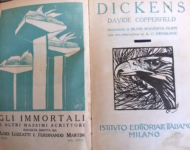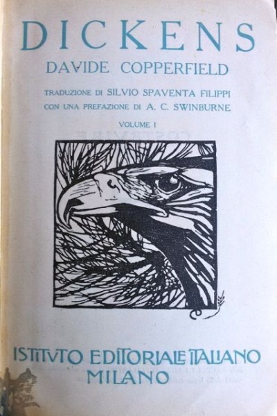 Edizione italiana in tre volumi di David Copperfield (The Personal History, Adventures, Experience and Observation of David Copperfield), romanzo di Charles Dickens (1812-1870) pubblicato per la prima volta nel 1850 dalla casa editrice Collins di Londra. Questa edizione del 1927 è a cura dell’Istituto Editoriale Italiano di Milano, per la collana «Gli Immortali e altri massimi scrittori» (prima serie, volumi IX, X, XXVII), con la traduzione di Silvio Spaventa Filippi e con una prefazione di A.C.Swinburne (Carlo Dickens, scritto pubblicato nel luglio del 1902 nella rivista Quarterly Review). Il testo è stato collazionato da Tommaso Di Petta. I fregi sono stati disegnati da Duilio Cambellotti. La collana «Gli Immortali e altri massimi scrittori» era diretta da Luigi Luzzati e Ferdinando Martini.