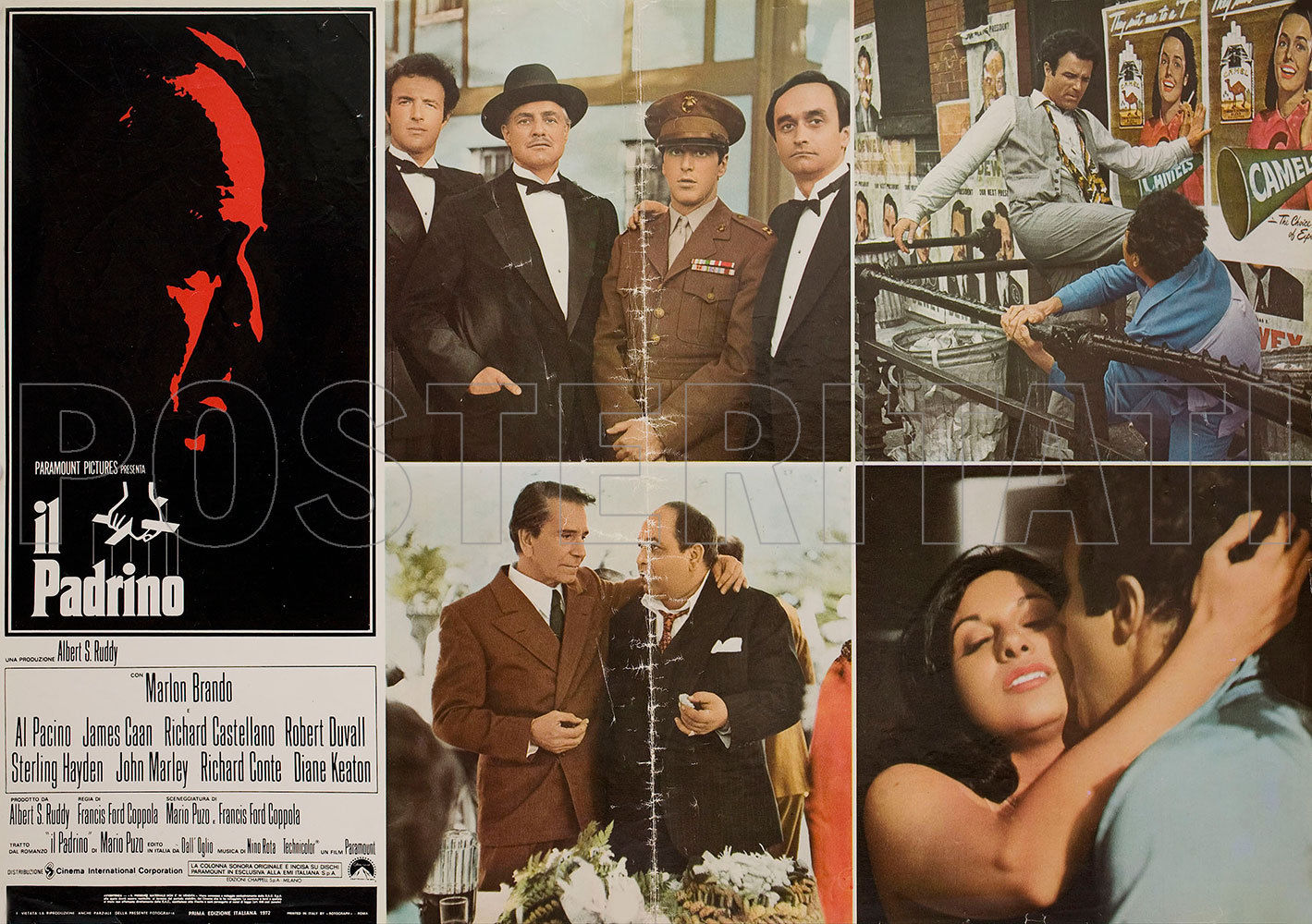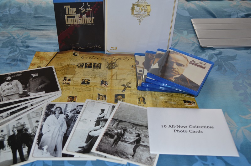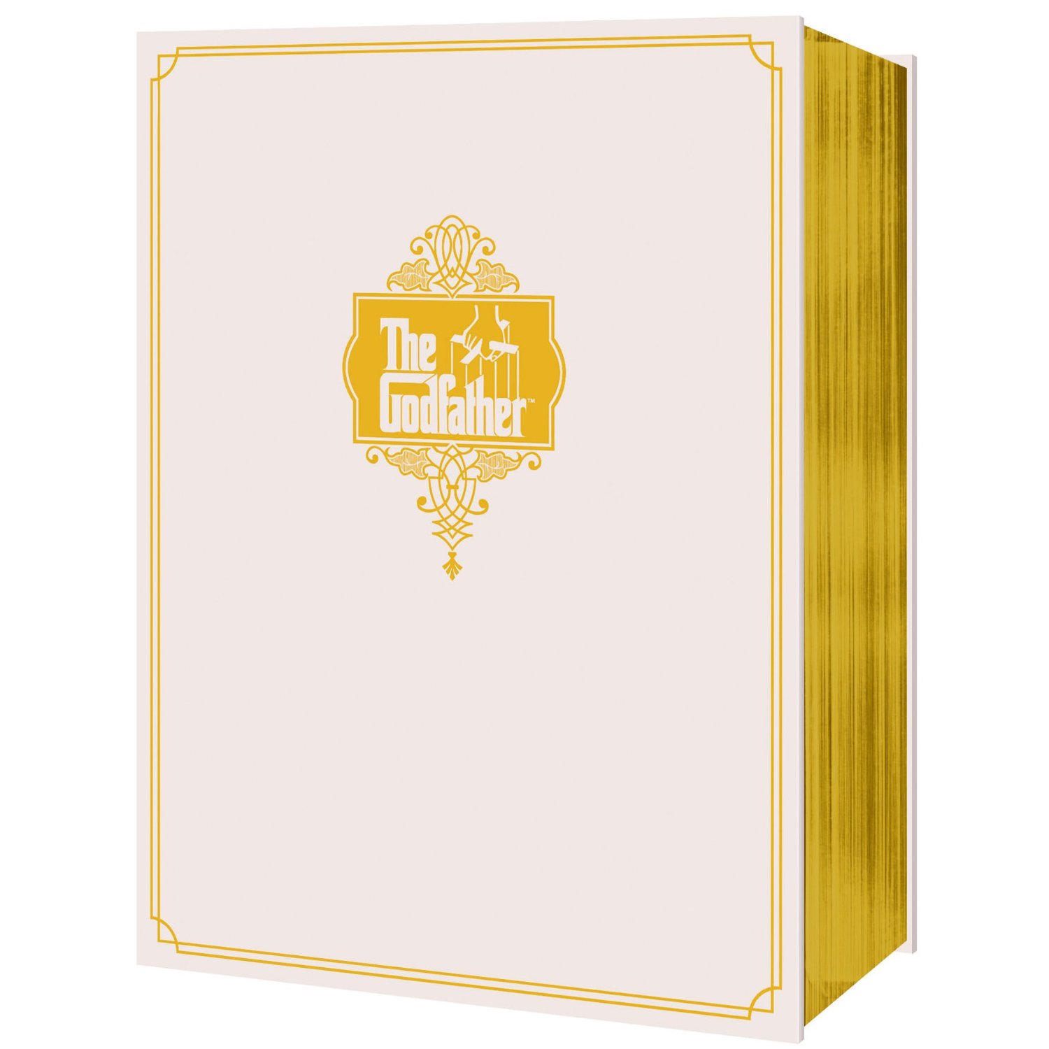 Edizione:  Collezione 40° Anniversario in Blu-ray del 2012: Box (cm. 29 x 23) contenente: Cofanetto (cm. 17, 5 x 13,5) con quattro Blu-ray ("The Godfather", "The Godfather, Part II", "The Godfather, Part III" e The Godfather/ Supplementi); The Godfather - Final Shooting Script - Screenplay by Mario Puzo and Francis Ford Coppola ; Busta contenente 10 cards virate color seppia con stills set (cm.12 x 18) di "The Godfather", "The Godfather, Part II", "The Godfather, Part III"; Mappa dell'albero genealogico della Famiglia Corleone (cm. 42 x 55)