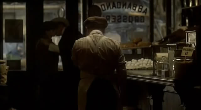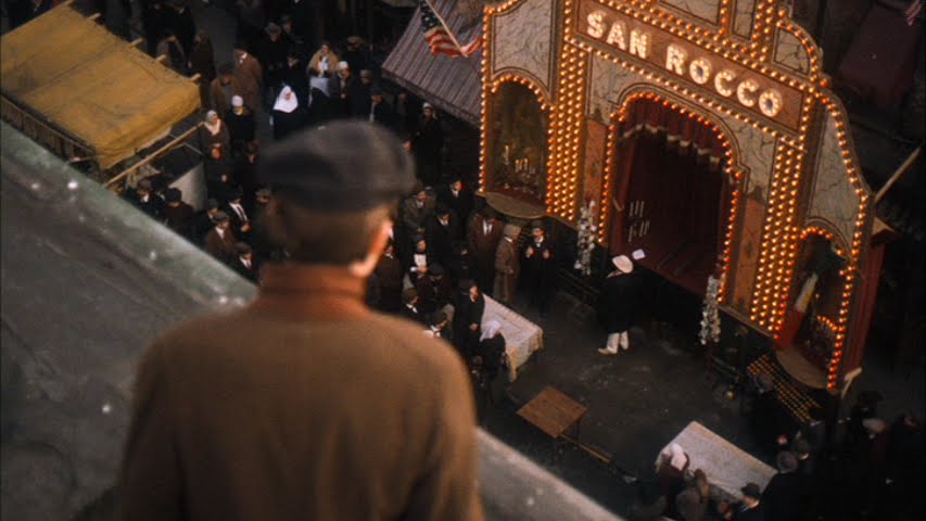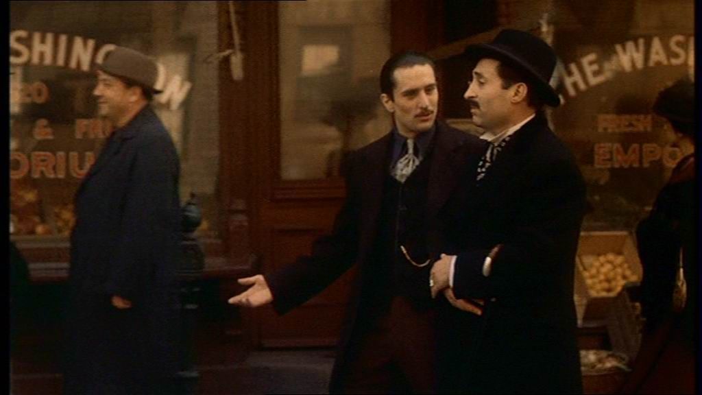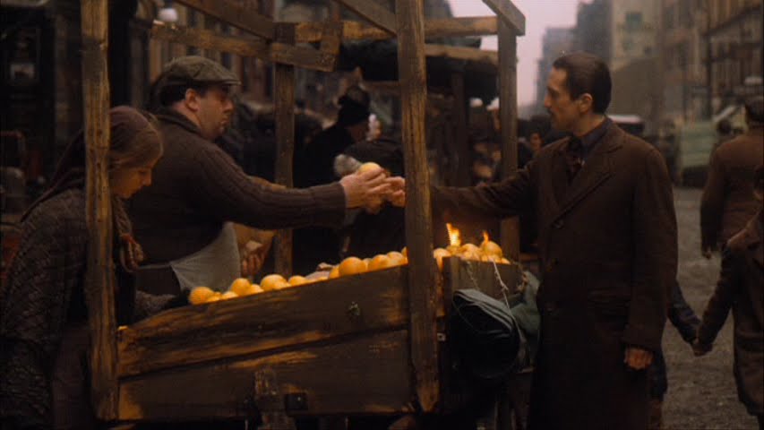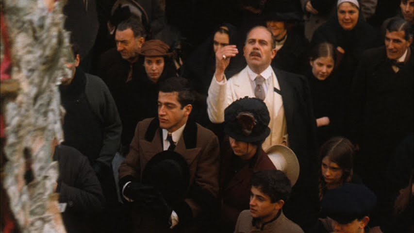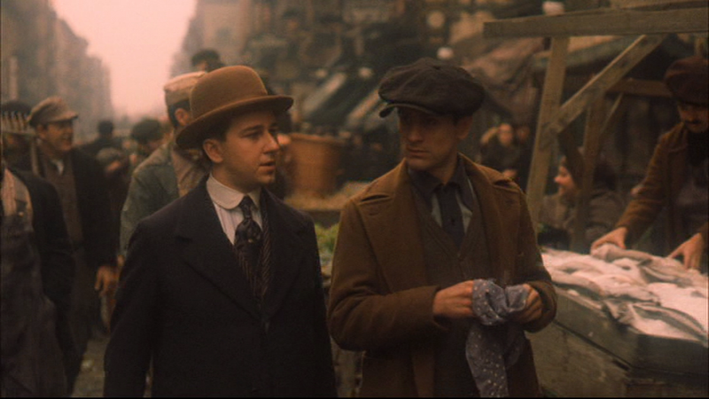 Una dissolvenza incrociata ci riporta nella Little Italy del 1917, dove Vito Corleone lavora in un negozio di alimentari per mantenere la moglie e il figlio Santino. Recatosi a teatro insieme all’amico Clemenza, il giovane s’imbatte in Fanucci, caporione della “Mano nera”, mentre questi minaccia con un coltello la figlia dell’impresario che non gli ha pagato l’ormai consueta tangente. E’ proprio Fanucci a imporre la sostituzione di Vito con un parente come garzone al negozio. Il giovane Corleone è così costretto ad assecondare la losca attività di Clemenza, ladro e ricettatore, diventando suo socio.
