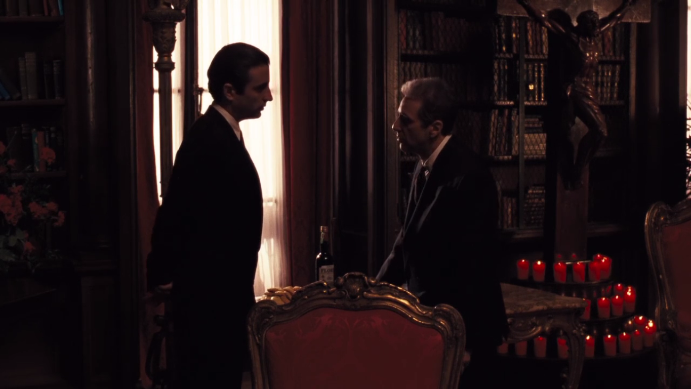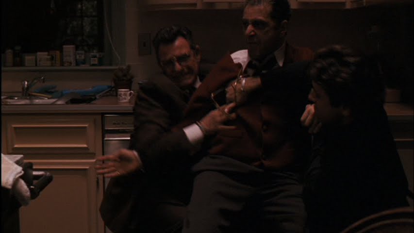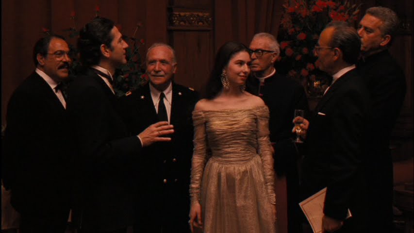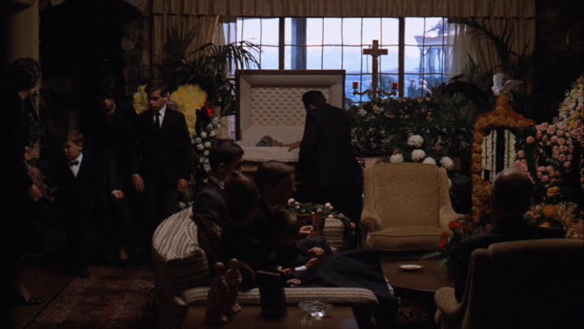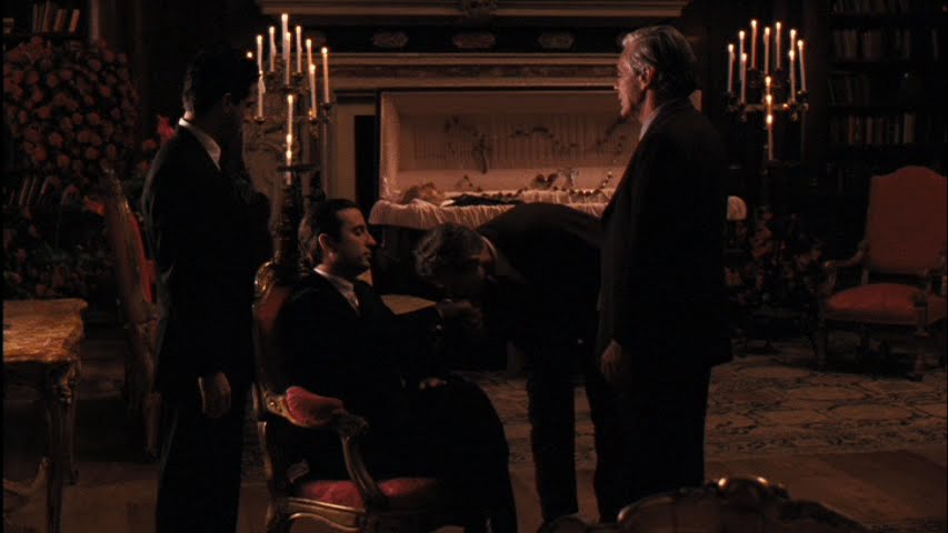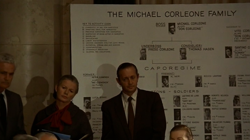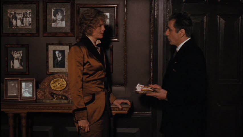 Già sconvolta dalle notizie della mattanza mafiosa, Kay assiste allo sfogo di Connie che accusa Michael di averle ucciso il marito. Michael si ribella alle richieste di chiarimento della moglie ma poi le concede un’unica e definitiva replica, negando spudoratamente ogni sua responsabilità su quei fatti. Kay sembra però comprendere la verità quando Michael riceve, nello studio che era di don Vito, i capiregime che s’inchinano davanti a lui baciandogli l’anello come segno di devozione: d’ora in poi lei sarà la moglie del nuovo “padrino”.
