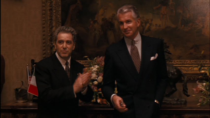 Siamo nel 1979 a New York. Michael Corleone, precocemente ingrigito e indebolito dal diabete, è ormai miliardario. Il figlio del “padrino” si è impegnato con tutte le sue forze in un’attività volta a guadagnarsi onorabilità sociale e a estraniare definitivamente la propria famiglia da Cosa Nostra. I Corleone sono ormai una holding, coinvolta nei traffici e negli scandali degli anni Settanta dove a fare da ponte nel riciclaggio di denaro sporco, tra gli Stati Uniti e l’Italia, c’è lo Ior e la piramide finanziaria delle banche governate da Michele Sindona. Non a caso il film si apre con la cerimonia del conferimento a Michael della “croce di San Sebastiano” che lo legittima come finanziere di fiducia del Vaticano. Al boss dei Corleone preme la sicurezza dell’amata figlia Mary, che ha trasformato in presidente onorario della “Fondazione Vito Andolini Corleone”, votata alla rinascita culturale e sociale della Sicilia. Durante il ricevimento che festeggia, con i consueti rituali rituali folcloristici, l’onorificenza di Michael, questi tenta invano di convincere il figlio Anthony a lavorare con lui. Il ragazzo, con l’ l’appoggio della madre Kay (finalmente riammessa dopo anni alla corte dei Corleone), dichiara di aver deciso di proseguire l’ormai avviata carriera di cantante lirico. Alla festa sono presenti, tra gli altri, Connie Corleone, ormai diventata la matrona della famiglia, assieme al nuovo “consigliori” Harrison, al nipote del defunto Tom Hagen (Andrew che si è fatto prete), all’attempato cantante Johnny Fontane e all’ambiguo, ma ancora sodale, “padrino” don Altobello. A disturbare sgradevolmente il rituale familiare provvede il boss in ascesa Joey Zasa, venuto a rendere omaggio ai Corleone. Irrompe come un ciclone pure l’aitante Vincent Mancini, figlio illegittimo di Sonny e irascibile quanto il padre, appoggiato da Connie per entrare nel clan familiare. Vincent prima flirta con una giornalista e poi viene colpito dall’avvenenza di Mary Corleone. Per verificare il suo temperamento, Michael lo fa incontrare nel suo studio con Zasa, reo di avere ingiuriato pubblicamente l’onorabilità dei Corleone. L’arrogante boss nega i fatti e, quando Michael propone a Vincent di fare la pace con lui, questi lo abbraccia staccandogli con un morso un lembo dell’orecchio. Pur contrariato per la brutalità dell’evento, Michael capisce di aver bisogno di Vincent e accetta la proposta, fattagli da Connie, di adottarlo come probabile erede, prevedendo di affidargli tutti gli affari sporchi. La stessa notte del ricevimento, dopo aver fatto l’amore con la giornalista, Vincent sventa un attentato ai suoi danni costringendo uno dei killer a svelare come mandante Joey Zasa.