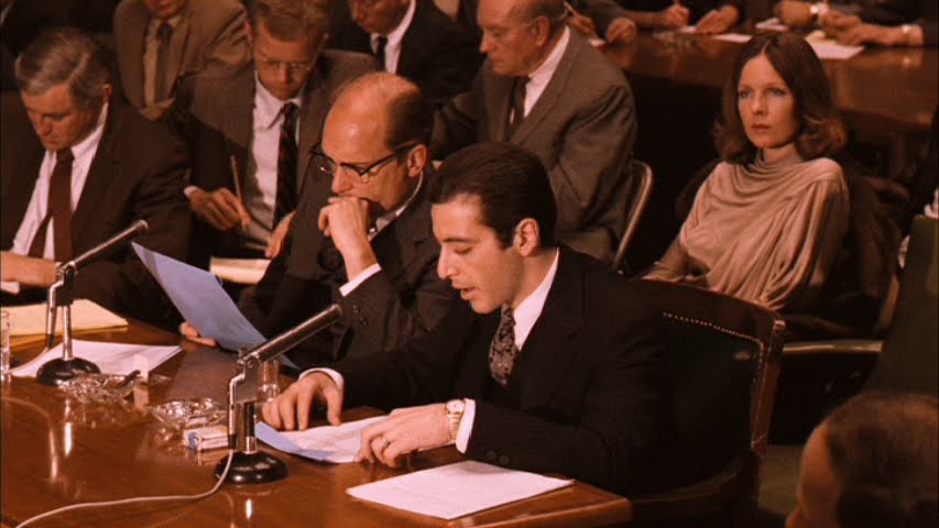 Il processo contro la famiglia Corleone è a una svolta: gli accusatori della commissione hanno in pugno, come supertestimone pentito, Frankie Pentangeli che, sopravvissuto all’agguato, è intenzionato a vendicarsi vuotando il sacco sulle sanguinarie imprese della famiglia Corleone. Michael ha però un asso nella manica: durante una delle sedute del processo, egli fa esibire il fratello di Pentangeli prelevato dalla Sicilia come un vero e proprio ostaggio. Quando Frankie lo vede, comprende il messaggio minaccioso e, davanti alla corte, ritratta la propria testimonianza per evitare il disonore del pentimento e una ritorsione nei confronti dei propri familiari. Scampato il pericolo, Michael mette al bando il fratello traditore e affronta la moglie Kay che, ormai disgustata del mondo violento del marito, gli rivela di avere abortito volutamente pur di non mettere al mondo un altro Corleone. Dopo un furioso alterco, Michael le impone il divorzio, concedendole di vedere solo saltuariamente i figli.