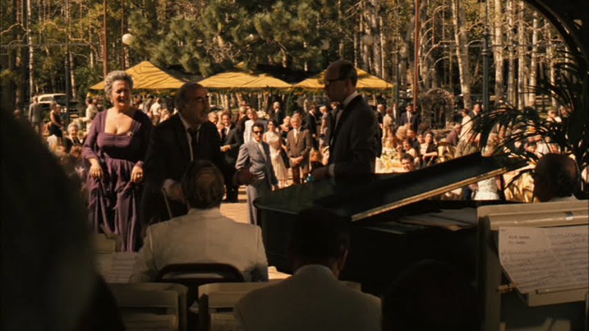Il matrimonio della figlia del boss, Connie, viene festeggiato secondo un tradizionale e fastoso rituale alla siciliana. Non sono pochi gli ospiti che approfittano dell’occasione per rendere omaggio al “padrino” chiedendogli favori dopo aver donato laute cifre per l’occasione: un impresario di pompe funebri, Bonasera, pretende vendetta per la figlia stuprata; il pasticciere Nazorine implora un permesso di soggiorno per il genero; il popolare cantante Johnny Fontane si lamenta del potente produttore Jack Woltz che non vuole affidargli il ruolo da protagonista in un suo film. Questi, dopo un primo diniego rivolto all’emissario Tom Hagen, si convince a concedere la parte al “figlioccio” di Vito Corleone sconvolto dal ritrovamento, sul proprio letto, della testa mozzata del purosangue prediletto. Qualche giorno dopo la cerimonia, il “don” riceve un pericoloso trafficante di droga in ascesa, Virgil Sollozzo detto il “Turco”, legato a una delle cinque famiglie mafiose della Grande Mela, quella dei Tattaglia: il Turco chiede a don Vito di spendere la sua influenza con poliziotti, magistrati e politici, e di investire con un milione di dollari su un lauto traffico di stupefacenti .