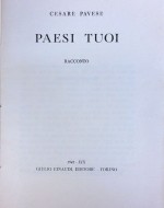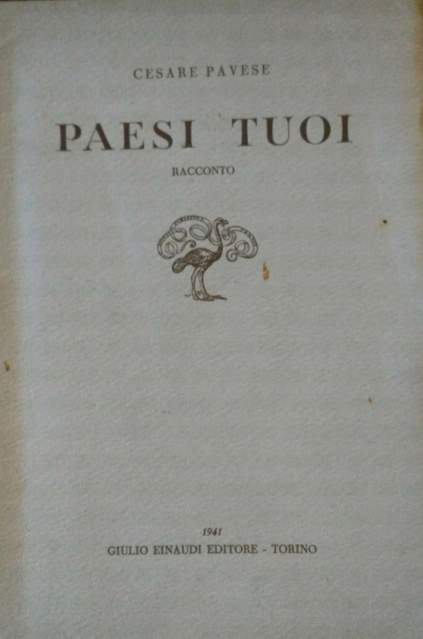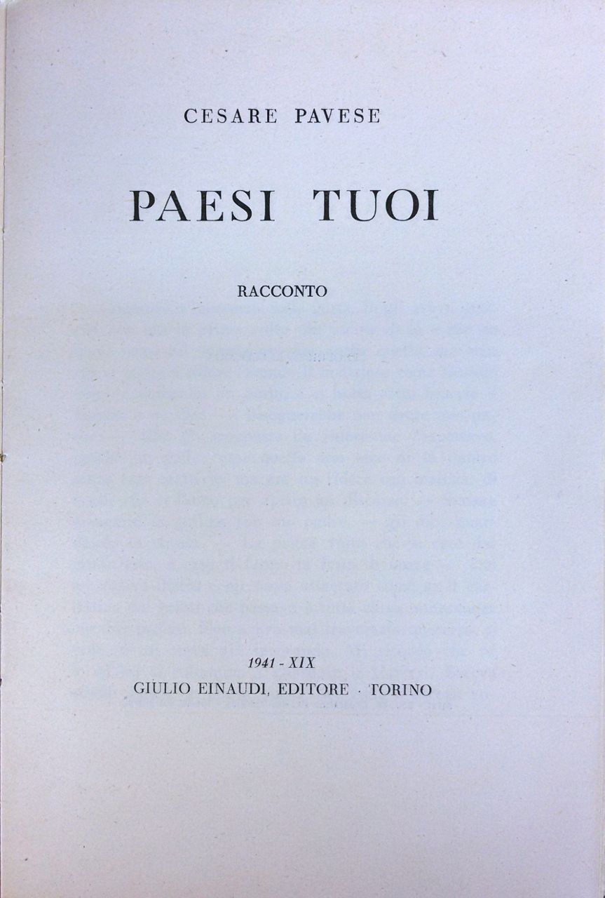 Prima edizione di Paesi tuoi, romanzo breve di Cesare Pavese scritto tra il giugno e l’agosto del 1939. È il primo romanzo pubblicato da Pavese, finito di stampare il 10 maggio 1941 negli stabilimenti torinesi della S.A.T.E.T. per Einaudi. Questo titolo inaugurò la collana einaudiana della «Biblioteca dello Struzzo», una collezione di autori italiani contemporanei che, come stava scritto al risvolto di questo primo esemplare, si proponeva di «raccogliere, senza preconcetti di chiesuola né di piazza, romanzi di giovani – narrazioni autentiche e impegnative, che valgano ciascuna come una fresca inconfondibile esperienza».